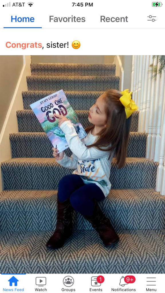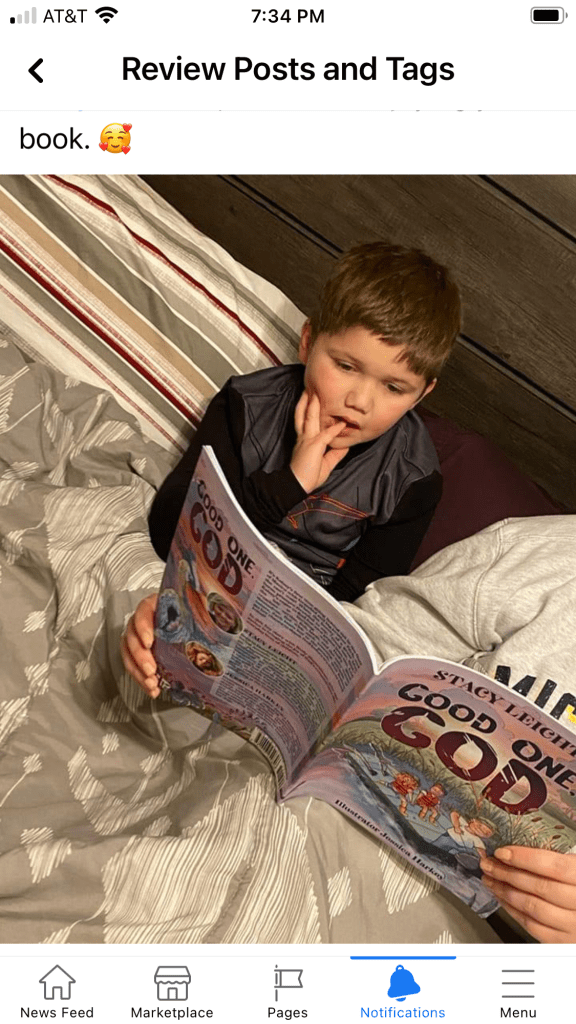 This picture was sent to me today by my college classmate Todd. This is a picture of his grandson with his book. He read it at school to his class with his sweet Mama! Thanks for sharing this picture Todd!